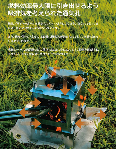 - [Environmentally friendly using eco-friendly fuel] 1. The firewood and branches used in bonfires are very environmentally friendly and can be collected on-site. 2. Compact but highly efficient in combustion. Easy to cook, such as boiling water. 3. Uses newspapers, magazines, and everyday wooden waste as fuel. Effective as a disaster prevention item. In addition, the bottom has a tray that is isolated from the ground, so there is no need to worry about the fire burning the ground. It is also designed so that even small ash after the bonfire does not fall to the ground.