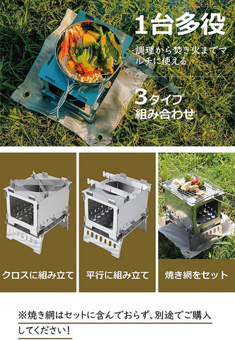 - [Easy to assemble and easy to carry] The mini bonfire stand is an essential item for solo camping. The fire bed is about 110 mm deep, so you can put in enough charcoal and firewood. The grate area is large, so you can enjoy outdoor cooking. This product is easy to carry as it is 20 mm thick when folded, making it recommended for motorcycle touring and hiking.